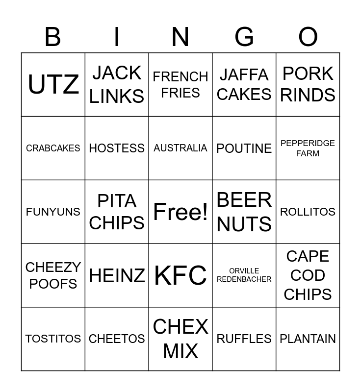 This bingo card has a free space and 75 words: DORITOS, EDAMAME, FRENCH FRIES, CHURROS, CRACKER JACKS, CURLY FRIES, PLANTERS, RITZ, TRISCUIT, GUACAMOLE, PIGS IN A BLANKET, CASHEW, AUSTRALIA, CRABCAKES, PIRATE'S BOOTY, PITA CHIPS, PIZZA ROLLS, PLANTAIN, POP CHIPS, PORK RINDS, FRITOS, FUNYUNS, HOSTESS, JACK LINKS, JAFFA CAKES, JIFFY POP, KETTLE BRAND, KETTLE CORN, LAY'S, LITTLE DEBBIE, MOCHI, NORWAY, ONION RINGS, ORVILLE REDENBACHER, PEPPERIDGE FARM, POUTINE, WETZEL'S PRETZLES, PRINGLES, ROLLITOS, RUFFLES, SLIM JIM, PRETZELS, SPRING ROLLS, SUN CHIPS, SWEDISH NUTS, TAKIS, TOSTITOS, UTZ, WISE, SAMOSA, TRADER JOE'S, KFC, TACO BELL, RANCH, BLUE DIAMOND, SALSA, DEVILED EGGS, CRAB RANGOONS, PUMPKIN SEEDS, BURGER KING, HEINZ, SLIDERS, CHICKEN FINGERS, ANTS ON A LOG, BAGEL BITES, BEER NUTS, BONDA, BUFFALO WINGS, BUGLES, CAPE COD CHIPS, CHEEZY POOFS, CHEETOS, CHEEZ-IT, CHEX MIX and CHIPS.