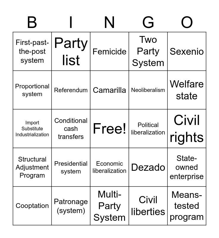 This bingo card has a free space and 24 words: Presidential system, Patronage (system), Camarilla, Cooptation, Sexenio, First-past-the-post system, Proportional system, Party list, Political liberalization, Economic liberalization, Neoliberalism, Import Substitute Industrialization, Dezado, State-owned enterprise, Referendum, Civil liberties, Civil rights, Femicide, Welfare state, Conditional cash transfers, Means-tested program, Structural Adjustment Program, Two Party System and Multi-Party System.