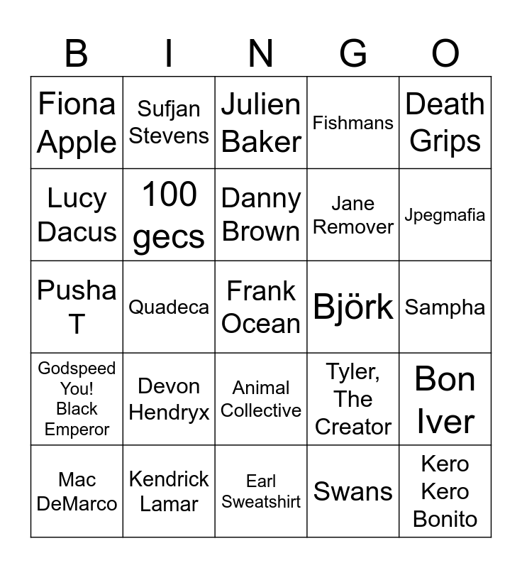 This bingo card has 25 words: Devon Hendryx, Earl Sweatshirt, Danny Brown, Mac DeMarco, Death Grips, Fiona Apple, Lucy Dacus, Sufjan Stevens, Björk, Animal Collective, Jane Remover, Pusha T, Tyler, The Creator, Bon Iver, 100 gecs, Kero Kero Bonito, Sampha, Julien Baker, Jpegmafia, Quadeca, Frank Ocean, Kendrick Lamar, Godspeed You! Black Emperor, Fishmans and Swans.