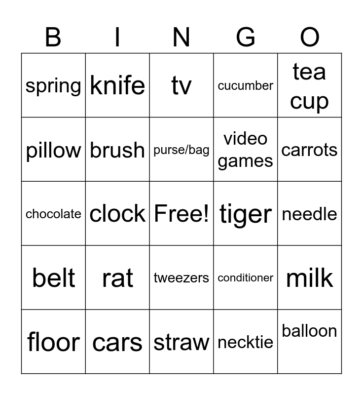 This bingo card has a free space and 24 words: rat, cars, purse/bag, floor, tea cup, spring, pillow, knife, tiger, tweezers, video games, chocolate, conditioner, milk, brush, necktie, needle, tv, carrots, clock, balloon, belt, cucumber and straw.