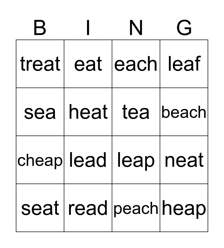 This bingo card has a free space and 15 words: seat, heap, each, treat, beach, sea, lead, peach, heat, cheap, neat, leaf, tea, eat and read.