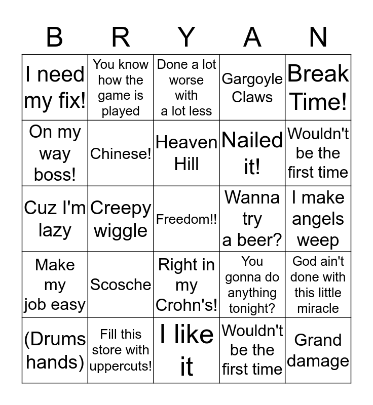 This bingo card has a free space and 24 words: Scosche, Fill this store with uppercuts!, Heaven Hill, (Drums hands), Break Time!, I need my fix!, On my way boss!, You know how the game is played, Wanna try a beer?, Right in my Crohn's!, Nailed it!, Cuz I'm lazy, You gonna do anything tonight?, God ain't done with this little miracle, Chinese!, Wouldn't be the first time, I make angels weep, Done a lot worse with a lot less, Wouldn't be the first time, Creepy wiggle, Grand damage, Make my job easy, Gargoyle Claws and I like it.