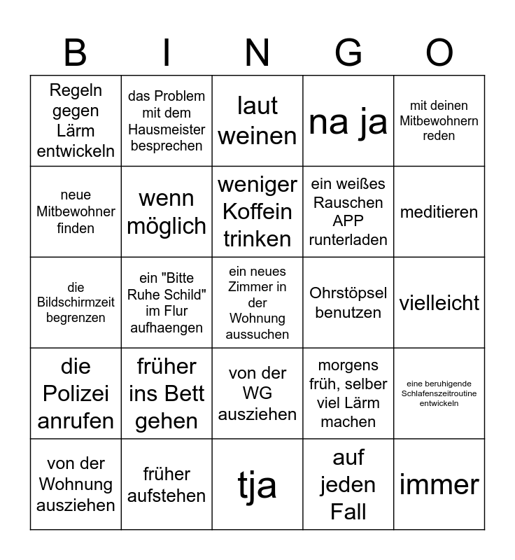 This bingo card has a free space and 24 words: früher ins Bett gehen, früher aufstehen, weniger Koffein trinken, von der Wohnung ausziehen, mit deinen Mitbewohnern reden, Regeln gegen Lärm entwickeln, neue Mitbewohner finden, das Problem mit dem Hausmeister besprechen, Ohrstöpsel benutzen, von der WG ausziehen, ein weißes Rauschen APP runterladen, die Bildschirmzeit begrenzen, morgens früh, selber viel Lärm machen, eine beruhigende Schlafenszeitroutine entwickeln, wenn möglich, auf jeden Fall, vielleicht, laut weinen, meditieren, ein "Bitte Ruhe Schild" im Flur aufhaengen, immer, die Polizei anrufen, na ja and tja.