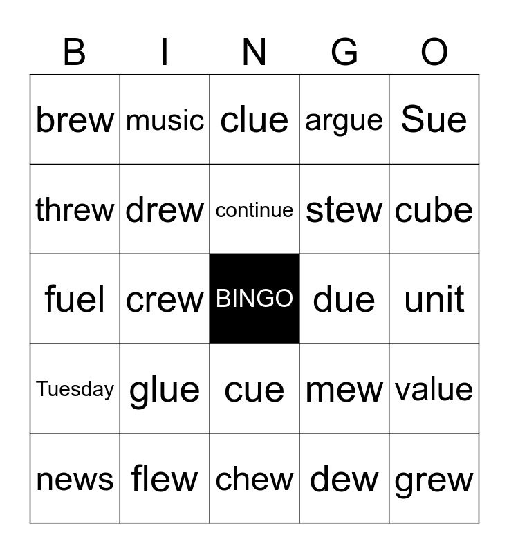 This bingo card has a free space and 29 words: news, true, crew, blue, brew, clue, drew, glue, due, flew, unit, grew, chew, dew, cube, huge, cue, Tuesday, Sue, fuel, mew, rescue, stew, threw, argue, music, value, continue and human.