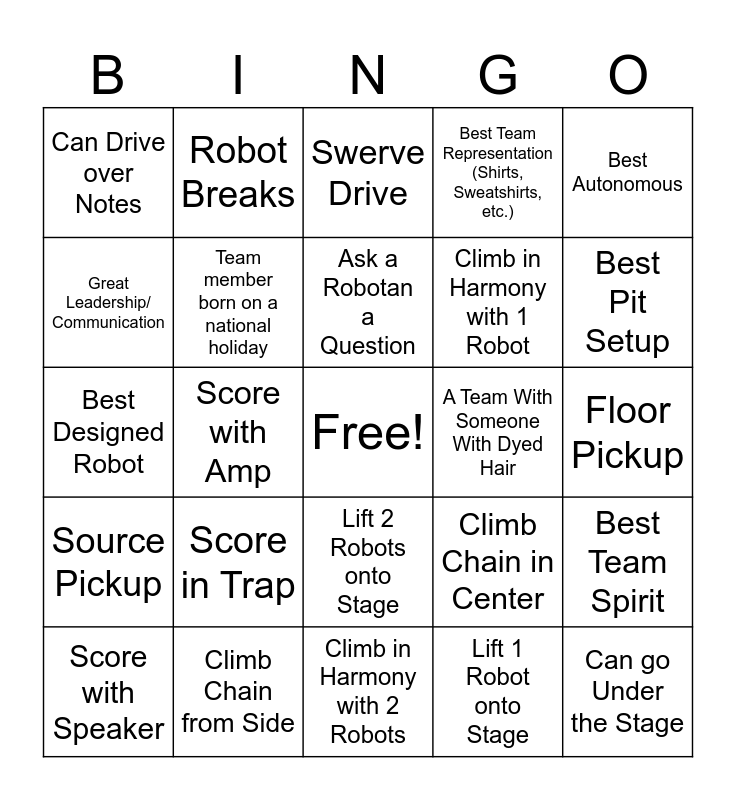 This bingo card has a free space and 24 words: Score in Trap, Climb Chain from Side, Ask a Robotan a Question, Score with Speaker, Best Autonomous, Can Drive over Notes, Great Leadership/ Communication, Robot Breaks, A Team With Someone With Dyed Hair, Lift 2 Robots onto Stage, Climb in Harmony with 1 Robot, Best Designed Robot, Climb Chain in Center, Best Team Spirit, Team member born on a national holiday, Lift 1 Robot onto Stage, Floor Pickup, Swerve Drive, Best Pit Setup, Score with Amp, Can go Under the Stage, Source Pickup, Best Team Representation (Shirts, Sweatshirts, etc.) and Climb in Harmony with 2 Robots.
