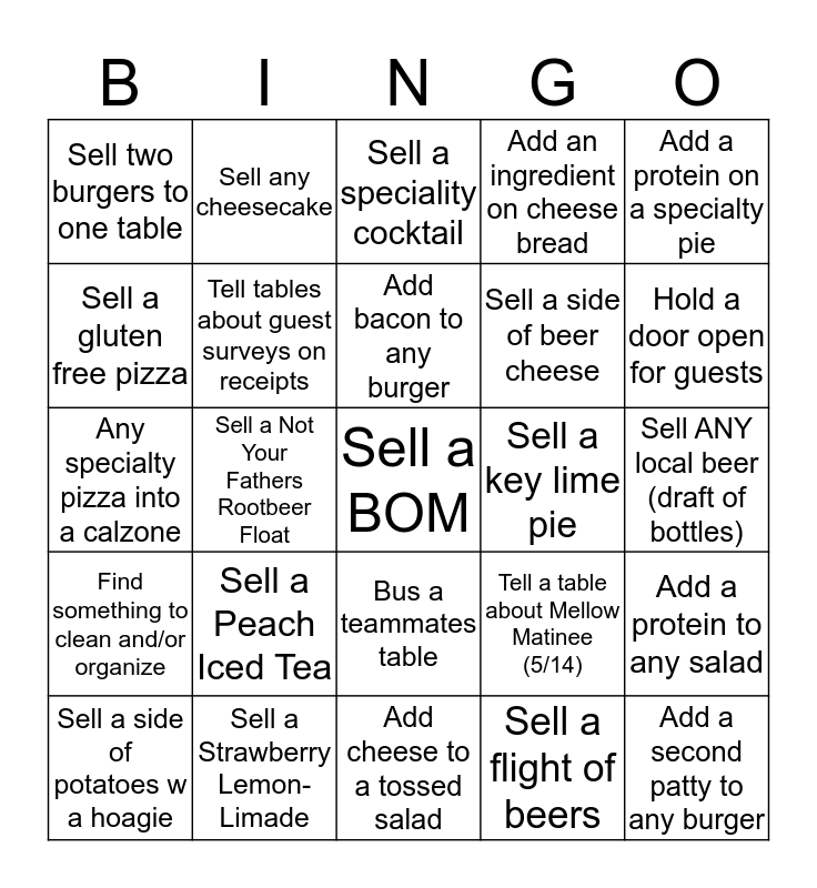 This bingo card has a free space and 24 words: Sell a Peach Iced Tea, Sell a Strawberry Lemon-Limade, Add bacon to any burger, Sell a side of potatoes w a hoagie, Add a protein on a specialty pie, Sell two burgers to one table, Sell a gluten free pizza, Sell any cheesecake, Sell a key lime pie, Bus a teammates table, Sell a side of beer cheese, Any specialty pizza into a calzone, Tell a table about Mellow Matinee (5/14), Add a protein to any salad, Tell tables about guest surveys on receipts, Sell a flight of beers, Sell ANY local beer (draft of bottles), Sell a speciality cocktail, Hold a door open for guests, Sell a Not Your Fathers Rootbeer Float, Add a second patty to any burger, Find something to clean and/or organize, Add an ingredient on cheese bread and Add cheese to a tossed salad.