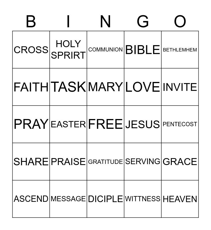 This bingo card has a free space and 24 words: PRAISE, MESSAGE, MARY, ASCEND, BETHLEMHEM, CROSS, FAITH, HOLY SPRIRT, JESUS, GRATITUDE, LOVE, PRAY, SERVING, GRACE, TASK, WITTNESS, PENTECOST, COMMUNION, INVITE, EASTER, HEAVEN, SHARE, BIBLE and DICIPLE.