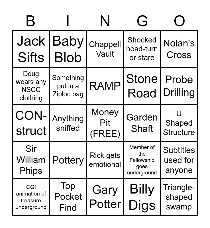 This bingo card has a free space and 24 words: Pottery, Top Pocket Find, RAMP, CGI animation of treasure underground, Nolan's Cross, Jack Sifts, Doug wears any NSCC clothing, Baby Blob, Garden Shaft, Rick gets emotional, Stone Road, CON-struct, Member of the Fellowship goes underground, Subtitles used for anyone, Something put in a Ziploc bag, Billy Digs, U Shaped Structure, Chappell Vault, Probe Drilling, Anything sniffed, Triangle-shaped swamp, Sir William Phips, Shocked head-turn or stare and Gary Potter.