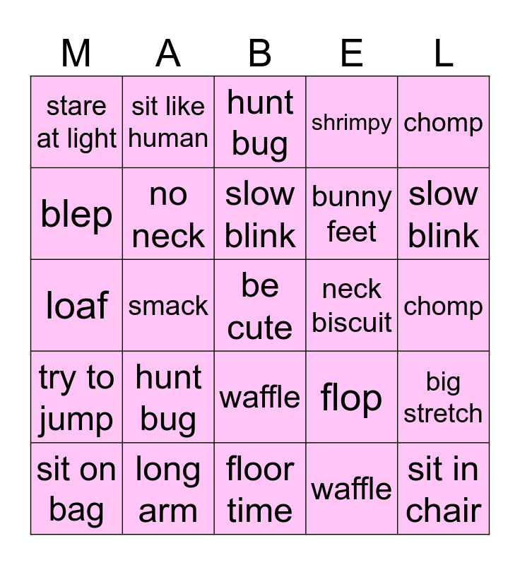 This bingo card has a free space and 24 words: hunt bug, long arm, slow blink, sit on bag, chomp, stare at light, blep, sit like human, neck biscuit, waffle, bunny feet, loaf, flop, big stretch, no neck, waffle, chomp, hunt bug, slow blink, smack, sit in chair, try to jump, shrimpy and floor time.