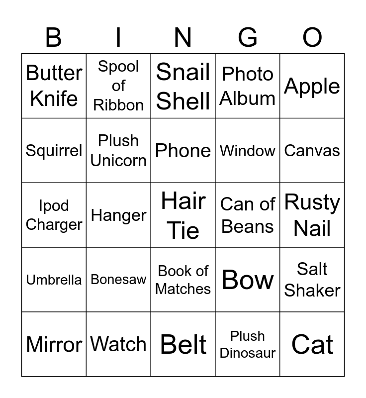 This bingo card has a free space and 24 words: Bonesaw, Watch, Phone, Mirror, Apple, Butter Knife, Squirrel, Spool of Ribbon, Can of Beans, Book of Matches, Window, Ipod Charger, Bow, Salt Shaker, Plush Unicorn, Plush Dinosaur, Rusty Nail, Snail Shell, Canvas, Hanger, Cat, Umbrella, Photo Album and Belt.