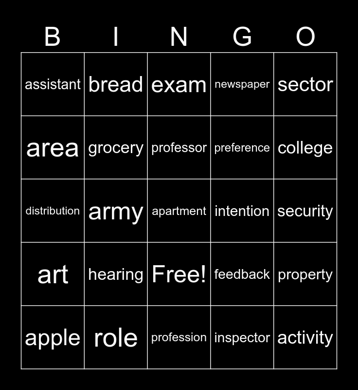 This bingo card has 26 words: Free!, inspector, professor, role, sector, assistant, area, bread, security, feedback, preference, distribution, property, apple, army, industry, newspaper, art, exam, apartment, college, profession, intention, hearing, grocery and activity.