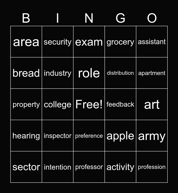 This bingo card has a free space and 25 words: inspector, professor, role, sector, assistant, area, bread, security, feedback, preference, distribution, property, apple, army, industry, newspaper, art, exam, apartment, college, profession, intention, hearing, grocery and activity.