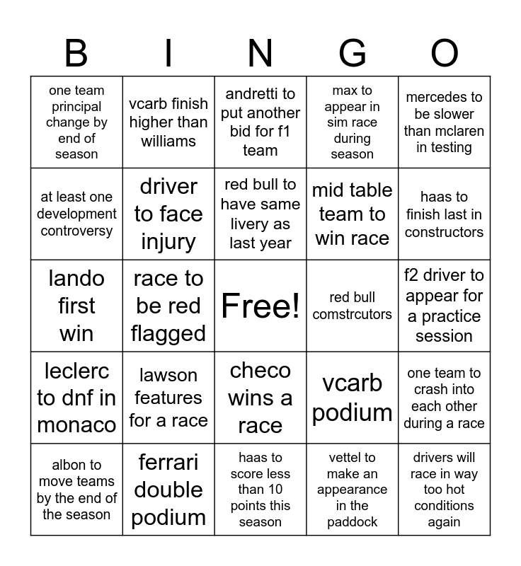 This bingo card has a free space and 24 words: lawson features for a race, ferrari double podium, red bull to have same livery as last year, albon to move teams by the end of the season, mercedes to be slower than mclaren in testing, one team principal change by end of season, at least one development controversy, vcarb finish higher than williams, red bull comstrcutors, checo wins a race, mid table team to win race, lando first win, vcarb podium, one team to crash into each other during a race, driver to face injury, vettel to make an appearance in the paddock, f2 driver to appear for a practice session, andretti to put another bid for f1 team, haas to finish last in constructors, race to be red flagged, drivers will race in way too hot conditions again, leclerc to dnf in monaco, max to appear in sim race during season and haas to score less than 10 points this season.
