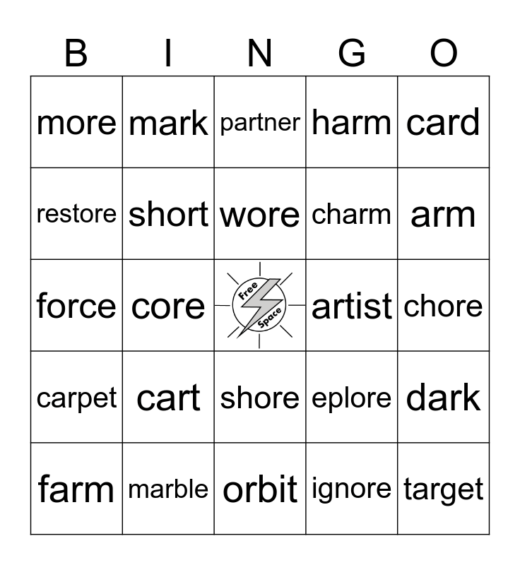 This bingo card has a free space and 24 words: cart, marble, wore, farm, card, more, restore, mark, artist, shore, charm, force, eplore, dark, short, ignore, chore, partner, arm, core, target, carpet, harm and orbit.