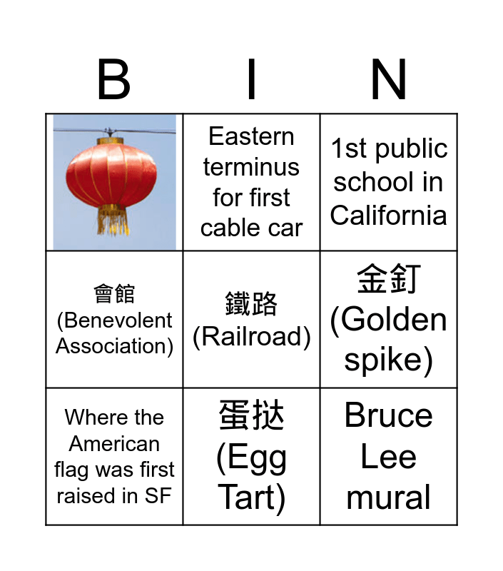 This bingo card has 1 images and 8 words: Where the American flag was first raised in SF, 1st public school in California, Eastern terminus for first cable car, 會館 (Benevolent Association), 金釘 (Golden spike), 鐵路 (Railroad), Bruce Lee mural and 蛋挞(Egg Tart).