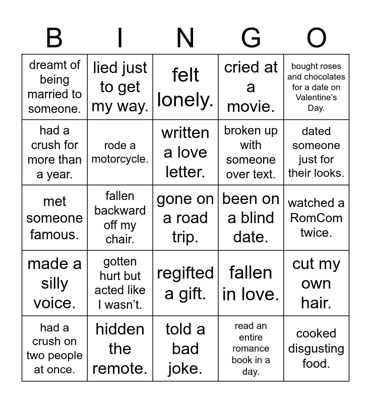 This bingo card has a free space and 24 words: gotten hurt but acted like I wasn’t., hidden the remote., written a love letter., had a crush on two people at once., bought roses and chocolates for a date on Valentine’s Day., dreamt of being married to someone., had a crush for more than a year., lied just to get my way., been on a blind date., regifted a gift., broken up with someone over text., met someone famous., fallen in love., cut my own hair., rode a motorcycle., read an entire romance book in a day., watched a RomCom twice., felt lonely., dated someone just for their looks., fallen backward off my chair., cooked disgusting food., made a silly voice., cried at a movie. and told a bad joke..