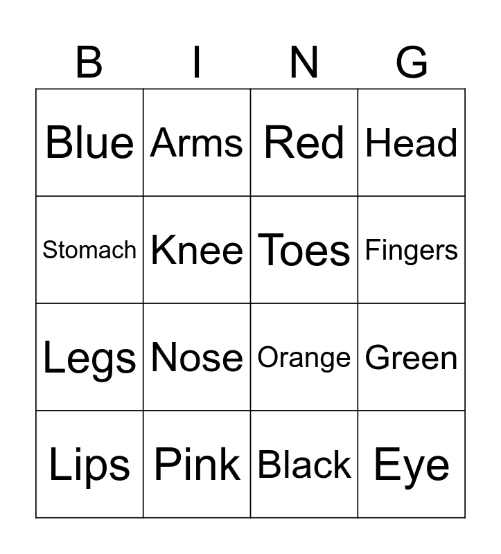 This bingo card has 16 words: Pink, Green, Red, Blue, Legs, Arms, Orange, Black, Stomach, Knee, Lips, Head, Nose, Fingers, Toes and Eye.