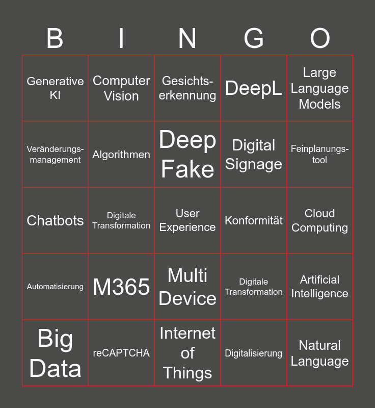 This bingo card has 25 words: M365, Internet of Things, Deep Fake, Big Data, Large Language Models, Generative KI, Veränderungs- management, Computer Vision, Konformität, Multi Device, Digital Signage, Chatbots, Digitale Transformation, Artificial Intelligence, Algorithmen, Natural Language, Cloud Computing, Gesichts-erkennung, Feinplanungs-tool, Digitale Transformation, User Experience, reCAPTCHA, Automatisierung, DeepL and Digitalisierung.