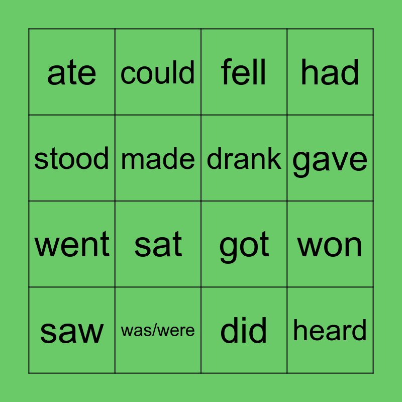 This bingo card has 21 words: was/were, broke, could, came, did, drank, ate, fell, got, gave, went, had, heard, lost, made, read, saw, sat, stood, won and wrote.