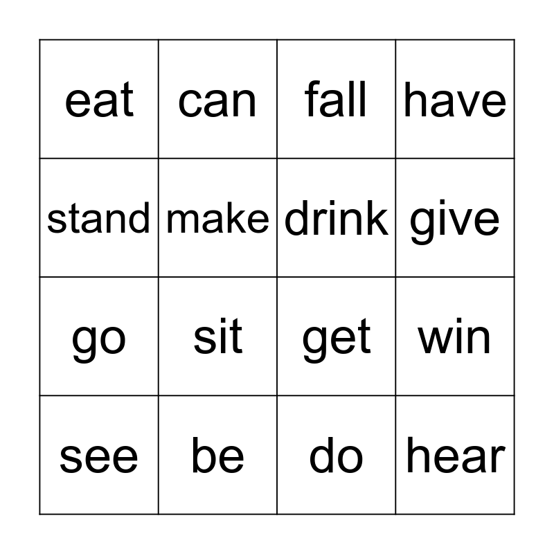This bingo card has 21 words: be, break, can, come, do, drink, eat, fall, get, give, go, have, hear, lose, make, read, see, sit, stand, win and write.