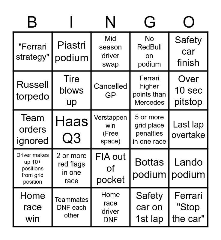 This bingo card has a free space and 24 words: 2 or more red flags in one race, Teammates DNF each other, Cancelled GP, Home race win, Safety car finish, "Ferrari strategy", Russell torpedo, Piastri podium, 5 or more grid place penalties in one race, FIA out of pocket, Ferrari higher points than Mercedes, Team orders ignored, Bottas podium, Lando podium, Tire blows up, Safety car on 1st lap, Last lap overtake, Mid season driver swap, Over 10 sec pitstop, Haas Q3, Ferrari "Stop the car", Driver makes up 10+ positions from grid position, No RedBull on podium and Home race driver DNF.