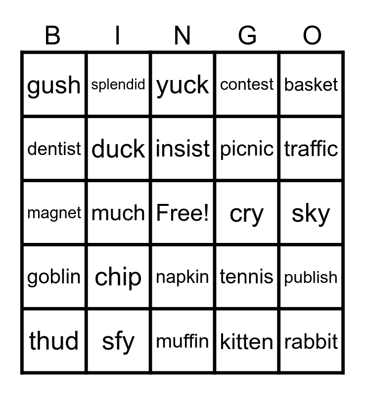 This bingo card has a free space and 29 words: thud, chug, much, shut, gush, yuck, duck, chip, cry, sfy, sky, rabbit, muffin, kitten, traffic, mattress, napkin, goblin, basket, magnet, tennis, mitten, picnic, dentist, contest, splendid, publish, insist and absent.
