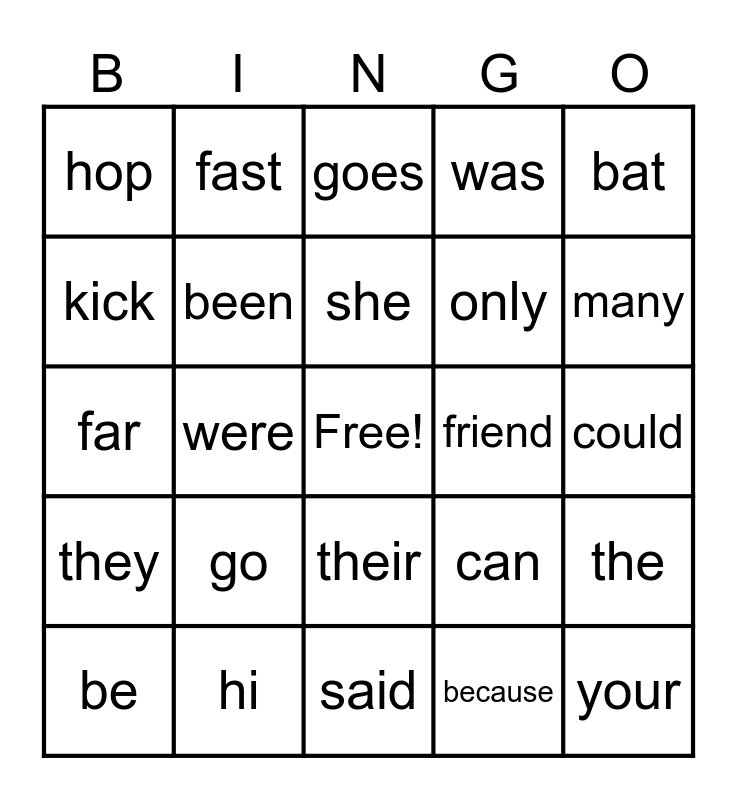 This bingo card has a free space and 24 words: go, hi, she, be, bat, hop, kick, fast, friend, their, only, far, can, the, been, because, could, goes, many, were, your, they, was and said.