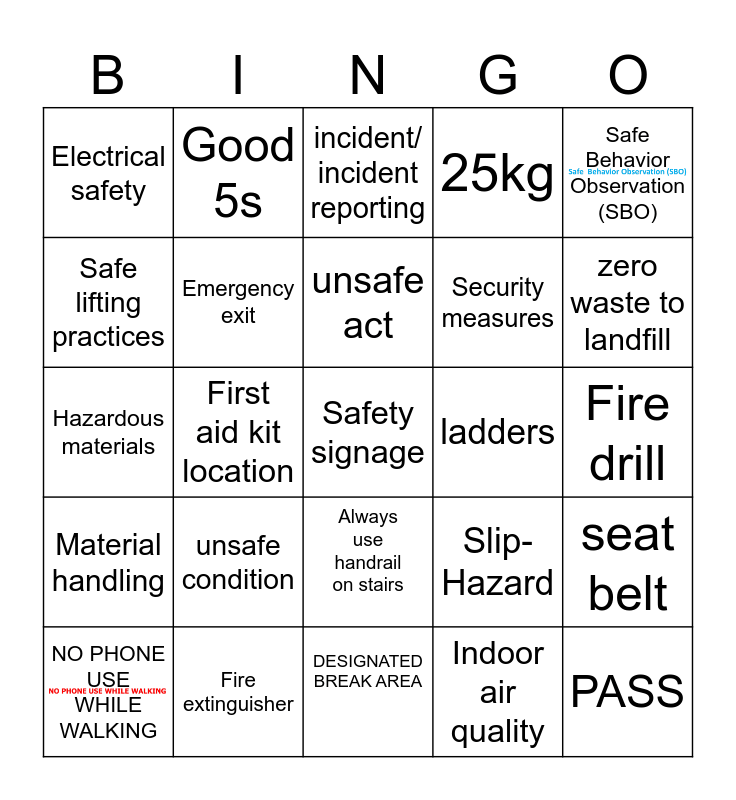 This bingo card has 2 images, a free space and 24 words: unsafe condition, Fire extinguisher, unsafe act, NO PHONE USE WHILE WALKING, Safe Behavior Observation (SBO), Electrical safety, Safe lifting practices, Good 5s, ladders, Always use handrail on stairs, Security measures, Hazardous materials, Slip-Hazard, seat belt, Emergency exit, Indoor air quality, Fire drill, incident/ incident reporting, zero waste to landfill, First aid kit location, PASS, Material handling, 25kg and DESIGNATED BREAK AREA .