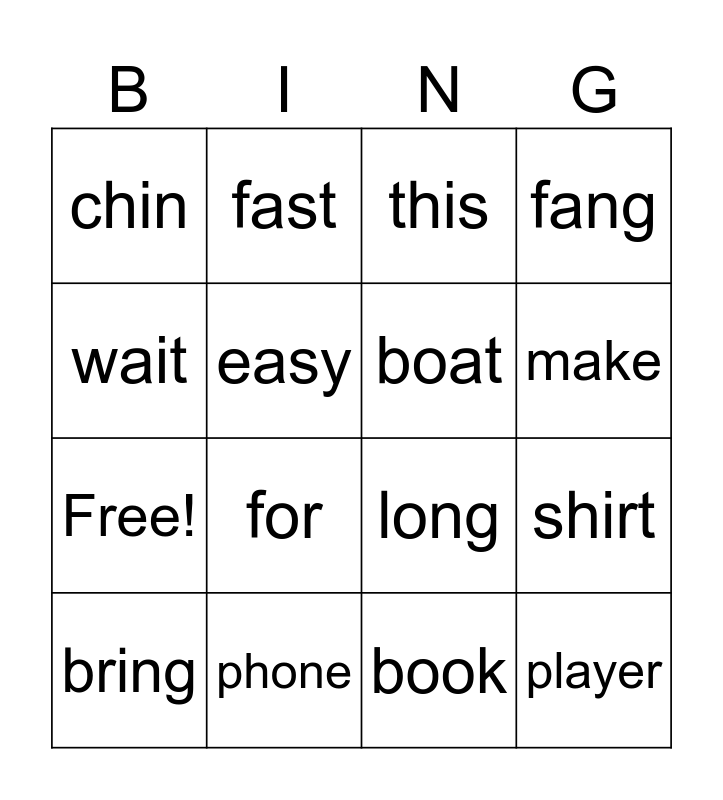 This bingo card has 20 words: shirt, hush, this, mark, bring, wait, phone, chin, Free!, fast, for, long, easy, player, boat, action, make, fang, book and new.
