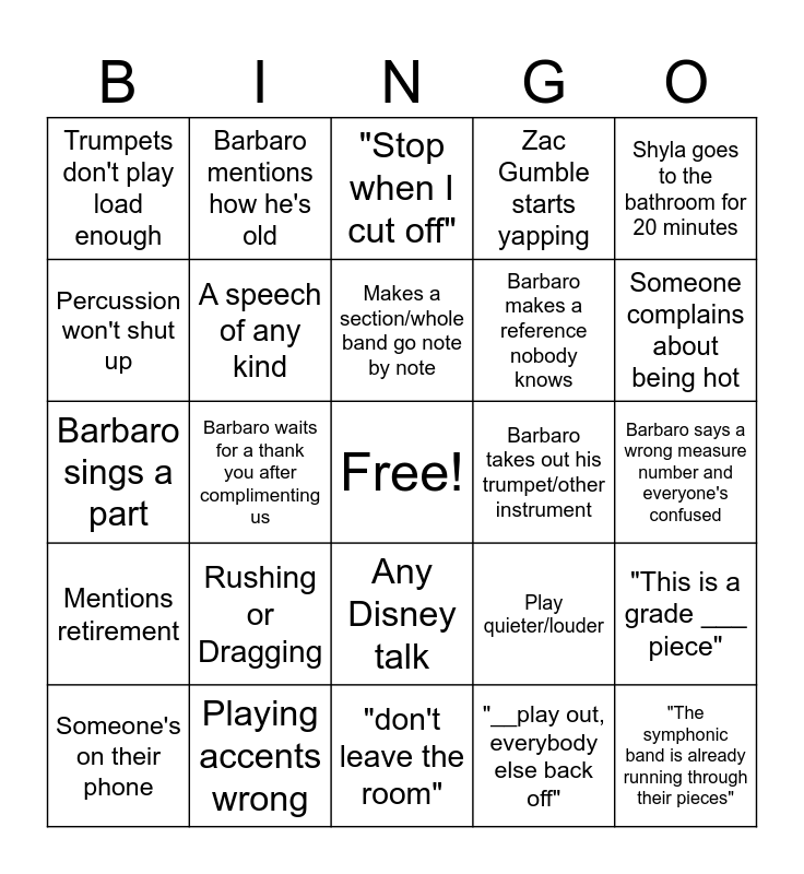 This bingo card has a free space and 24 words: Rushing or Dragging, Playing accents wrong, Makes a section/whole band go note by note, Someone's on their phone, Shyla goes to the bathroom for 20 minutes, Trumpets don't play load enough, Percussion won't shut up, Barbaro mentions how he's old, Barbaro takes out his trumpet/other instrument, Any Disney talk, Barbaro makes a reference nobody knows, Barbaro sings a part, Play quieter/louder, "This is a grade ___ piece", A speech of any kind, "__play out, everybody else back off", Barbaro says a wrong measure number and everyone's confused, "Stop when I cut off", Someone complains about being hot, Barbaro waits for a thank you after complimenting us, "The symphonic band is already running through their pieces", Mentions retirement, Zac Gumble starts yapping and "don't leave the room".