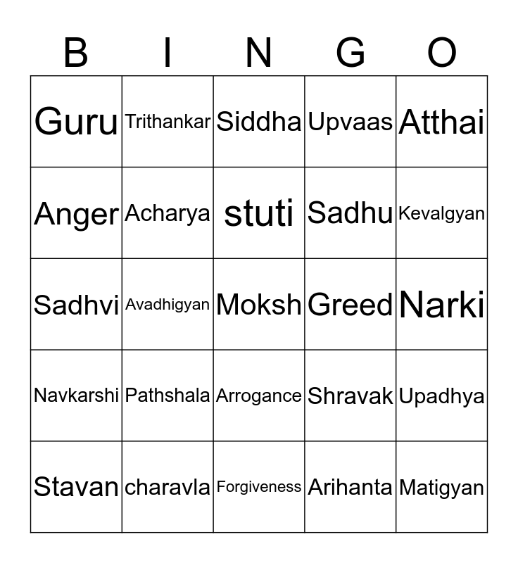 This bingo card has a free space and 24 words: Pathshala, charavla, stuti, Stavan, Atthai, Guru, Anger, Trithankar, Greed, Arrogance, Sadhu, Sadhvi, Shravak, Upadhya, Acharya, Arihanta, Narki, Siddha, Kevalgyan, Avadhigyan, Matigyan, Navkarshi, Upvaas and Forgiveness.