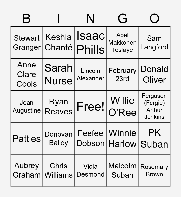 This bingo card has a free space and 24 words: Donovan Bailey, Chris Williams, Lincoln Alexander, Aubrey Graham, Sam Langford, Stewart Granger, Anne Clare Cools, Keshia Chanté, Willie O'Ree, Feefee Dobson, February 23rd, Jean Augustine, Winnie Harlow, PK Suban, Sarah Nurse, Malcolm Suban, Ferguson (Fergie) Arthur Jenkins, Isaac Phills, Donald Oliver, Ryan Reaves, Rosemary Brown, Patties, Abel Makkonen Tesfaye and Viola Desmond.