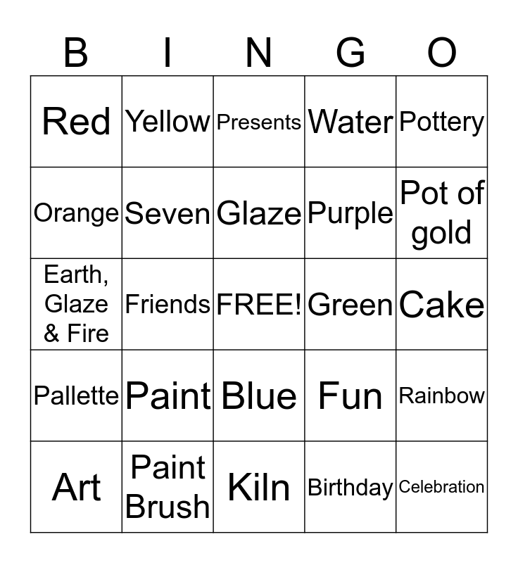 This bingo card has a free space and 24 words: Paint, Paint Brush, Glaze, Art, Pottery, Red, Orange, Yellow, Green, Blue, Purple, Earth, Glaze & Fire, Fun, Rainbow, Seven, Birthday, Cake, Presents, Pot of gold, Friends, Celebration, Pallette, Water and Kiln.