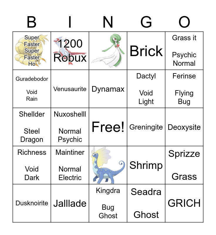 This bingo card has 23 images, a free space and 96 words: Byes, Lose, Dischargeing, Cosming, Cold Cold Colding, Slow Slow Slowing Slowing, Go, Tickleing tickled Tickleing tickled Tickleing tickled Slowing, Pidgeotite, Faster Faster Faster Faster Faster Stopping, Tickleing tickled Tickleing tickled Tickleing tickled Stoping stopping, Already Bought, Super Faster Super Faster Ho, 1200 Robux, Ho go Ho Go Ho Go Ho Go Tickleing Tickleing Tickleing Tickleing Tickleing Tickleing Tickleing Tickleing Tickleing, Already Crafted, Seal, Pasteing, Already Walked, Ha Haa Haaa Haaaa Haaaaa Haaaaaa, Tickle Tickle Oddish Tickle Tickle Tickle Oddish Garbodor Gardevoir Tickle Tickle Sylveon LunalaTranquill Beedrill Gallade Gallade Slow Tickle Tickle Tickle Tickle Tickle. Gardevoir, Swirlx Grass Psychic, Sprizze Grass, Dynamax, Stonjourner Ground Water, Pigeotto Psychic, Hakamo-o Fairy Fighting, Kingdra Bug Ghost, Seadra Ghost, Horsea Ghost, Lintien Dark Normal, Nuxoshelll Normal Psychic, Shellder Steel Dragon, Girdevoir Bug Normal, Penguinit Normal Fairy, Felgatr, Maintiner Normal Electric, Meitne Rock Flying, Ferinse Flying Bug, Brick, Jalllade, Aromasire Fairy Psyhic, Fire, Kirlia Normal Bug, Ash Greninga, Tortures Normal, Weasnie Bug Psychic, Ribbonras Light Psychic, GRICH, Shrimp, Groute Psychic Bug, Bugablast Fire Poison, Katrina Steel Cosmic, Sirasfetch’d Flying Psychic, Starimie Fairy Psychic, Grichine Cosmic Void, For an Cosmic Grass, Dhelimis Fin neon Fairy, Mega lillgant Grass Fighting, Fringe Grass Void, Grass Gardevoir Psychic Fairy, Feebas, Grass it Psychic Normal, Spoil Steel Rock, Grass Gallade Psychic Fighting, Kirlia stars Void Cosmic, Richness Void Dark, Umbreon Cosmic Void, Dactyl Void Light, Guradebodor Void Rain, Grids Bug Void, Flabèbè, Gardevoirite, Venusaurite, Spooky, Absolite, Audinite, Greningite, Lapranite, Zoroarkite, Slowkinite, Slowbroite, Banttle, Virizonite, Cobbalionite, Deoxysite, Dusknoirite, Snorlaxite, Xatuite, Amparosite, Butterfreeite, Lumineomite, Finneonite, Jolteonite, Bellosomite and Exeggutorite.