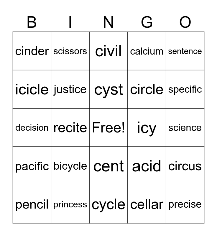 This bingo card has a free space and 26 words: cent, cellar, cyst, princess, sentence, cinder, icicle, scissors, science, acid, circle, decision, circus, pencil, recite, city, calcium, pacific, civil, precise, specific, cycle, icy, bicycle, justice and instance.