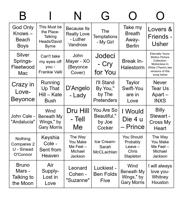 ⚠ This card has duplicate items: God Only Knows – Beach Boys (2), Someone Like You – Adele (2), Running Up That Hill – Kate Bush (2), The Way You Make Me Feel – Michael Jackson (2), Never Tear Us Apart – INXS (2), It Had to Be You – Harry Connick Jr. (2), Wind Beneath My Wings," by Gary Morris (2), I'll Stand By You," by The Pretenders (2), You Are So Beautiful," by Joe Cocker (2), You Should Probably Leave – Chris Stapleton (2), I Would Die 4 u – Prince (2), Take Me With U – Prince (2)