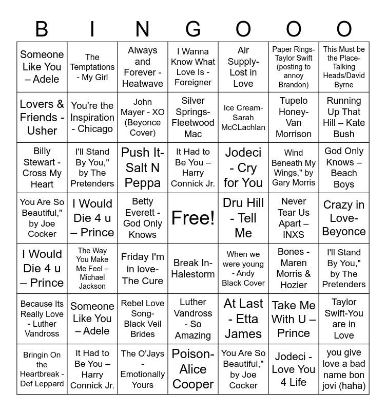 This bingo card has a free space and 76 words: I will always love you-Whitney Houston, Because Its Really Love - Luther Vandross, Always and Forever - Heatwave, At Last - Etta James, I Will Always Love You - Dolly Parton not Whitney, Luckiest - Ben Folds Five, Bones - Maren Morris & Hozier, Leonard Cohen - "Suzanne", When we were young - Andy Black Cover, Nothing Compares 2 U - Sinead O'Connor, you give love a bad name bon jovi (haha), Can't take my eyes off you - Frankie Valli, Lovers & Friends - Usher, Paper Rings- Taylor Swift (posting to annoy Brandon), Eternally Yours: Motion Picture Collection- Motionless In White (There's two versions of this song haha), Ice Cream-Sarah McCLachlan, Crazy in Love-Beyonce, Tupelo Honey-Van Morrison, Take my Breath Away-Berlin, Air Supply- Lost in Love, Break In- Halestorm, Silver Springs- Fleetwood Mac, This Must be the Place- Talking Heads/David Byrne, The Temptations - My Girl, I Wanna Know What Love Is - Foreigner, Poison- Alice Cooper, Bringin On the Heartbreak - Def Leppard, The O'Jays - Emotionally Yours, Love Bites- Def Leppard, Bruno Mars - Talking to the Moon, Friday I'm in love- The Cure, Forever - The Beach Boys, John Cale - "Andalucia", Jodeci - Cry for You, John Mayer - XO (Beyonce Cover), You're the Inspiration - Chicago, My Heart - The Interrupters, D'Angelo - Lady, Billy Stewart - Cross My Heart, Betty Everett - God Only Knows, Luther Vandross - So Amazing, Rebel Love Song- Black Veil Brides, Jodeci - Love You 4 Life, Tevin Campbell - Can We Talk, Keyshia Cole - Sent from Heaven, Dru Hill - Tell Me, God Only Knows – Beach Boys, Someone Like You – Adele, Running Up That Hill – Kate Bush, The Way You Make Me Feel – Michael Jackson, Never Tear Us Apart – INXS, It Had to Be You – Harry Connick Jr., Wind Beneath My Wings," by Gary Morris, I'll Stand By You," by The Pretenders, You Are So Beautiful," by Joe Cocker, You Should Probably Leave – Chris Stapleton, I Would Die 4 u – Prince, Take Me With U – Prince, Taylor Swift-Lover, Taylor Swift-You are in Love, Push It-Salt N Peppa, Still the One (Shania Twain Cover)-boygenius, Hits Different-Taylor Swift, Taylor Swift-This Love, God Only Knows – Beach Boys, Someone Like You – Adele, Running Up That Hill – Kate Bush, The Way You Make Me Feel – Michael Jackson, Never Tear Us Apart – INXS, It Had to Be You – Harry Connick Jr., Wind Beneath My Wings," by Gary Morris, I'll Stand By You," by The Pretenders, You Are So Beautiful," by Joe Cocker, You Should Probably Leave – Chris Stapleton, I Would Die 4 u – Prince and Take Me With U – Prince.