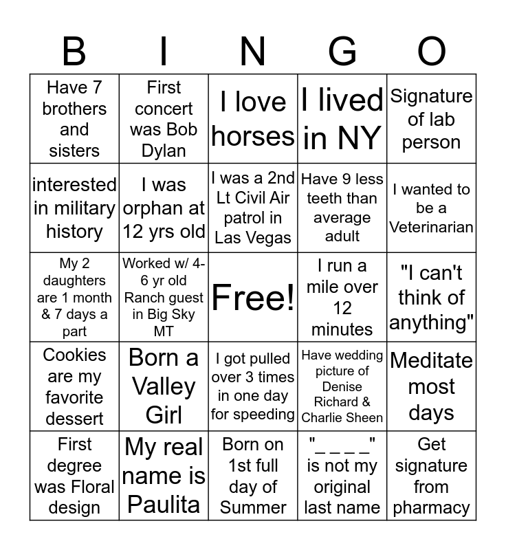 This bingo card has a free space and 24 words: Born a Valley Girl, My real name is Paulita, I was a 2nd Lt Civil Air patrol in Las Vegas, First degree was Floral design, Signature of lab person, Have 7 brothers and sisters, interested in military history, First concert was Bob Dylan, I run a mile over 12 minutes, I got pulled over 3 times in one day for speeding, Have 9 less teeth than average adult, My 2 daughters are 1 month & 7 days a part, Have wedding picture of Denise Richard & Charlie Sheen, Meditate most days, I was orphan at 12 yrs old, "_ _ _ _" is not my original last name, "I can't think of anything", I love horses, I wanted to be a Veterinarian, Worked w/ 4-6 yr old Ranch guest in Big Sky MT, Get signature from pharmacy, Cookies are my favorite dessert, I lived in NY and Born on 1st full day of Summer.