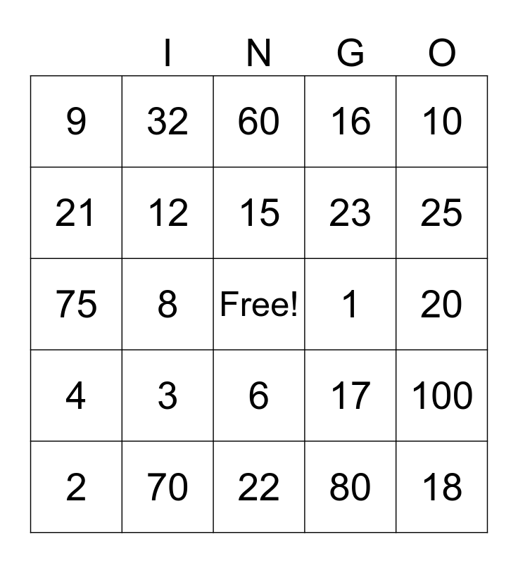 This bingo card has a free space and 39 words: 14, 7, 13, 12, 2, 6, 15, 0, 10, 4, 8, 16, 18, 20, 1, 3, 5, 9, 11, 17, 21, 22, 23, 25, 24, 30, 28, 26, 27, 32, 40, 50, 60, 70, 80, 90, 100, 75 and 55.