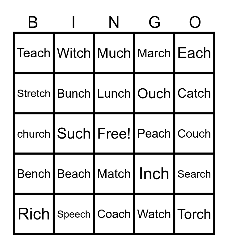 This bingo card has a free space and 24 words: Beach, Speech, Lunch, Rich, Each, Teach, Stretch, Witch, Peach, Match, Ouch, church, Inch, Search, Bunch, Watch, Couch, Much, Catch, Such, Torch, Bench, March and Coach.