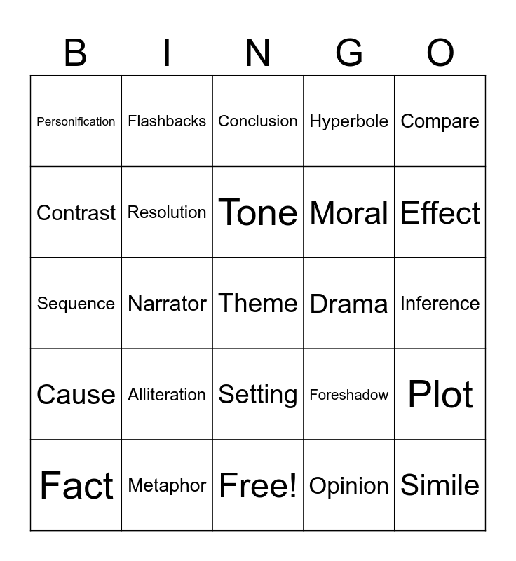 This bingo card has 25 words: Cause, Metaphor, Theme, Opinion, Compare, Personification, Flashbacks, Conclusion, Drama, Plot, Contrast, Resolution, Free!, Foreshadow, Effect, Fact, Narrator, Tone, Moral, Inference, Sequence, Alliteration, Setting, Hyperbole and Simile.