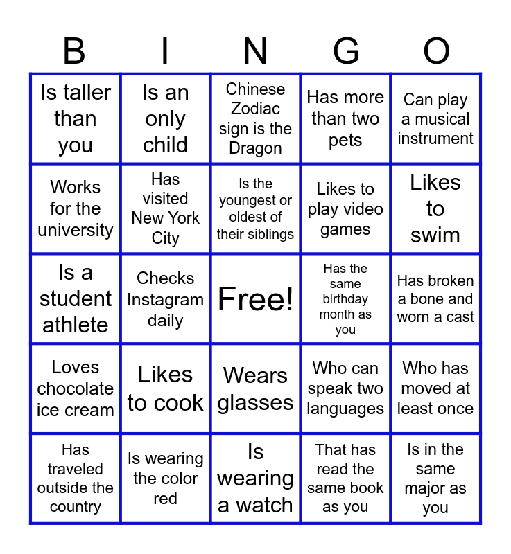 This bingo card has a free space and 24 words: Likes to cook, Is wearing the color red, Is the youngest or oldest of their siblings, Has traveled outside the country, Can play a musical instrument, Is taller than you, Works for the university, Is an only child, Has the same birthday month as you, Wears glasses, Likes to play video games, Is a student athlete, Who can speak two languages, Who has moved at least once, Has visited New York City, That has read the same book as you, Has broken a bone and worn a cast, Chinese Zodiac sign is the Dragon, Likes to swim, Checks Instagram daily, Is in the same major as you, Loves chocolate ice cream, Has more than two pets and Is wearing a watch.