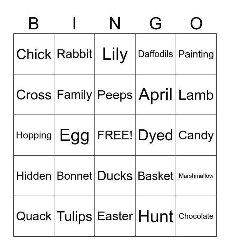 This bingo card has a free space and 31 words: Easter, Spring, Egg, Bunny, Chick, Lily, Family, Basket, Dyed, Hunt, Candy, Chocolate, Jellybeans, Sunday, Lamb, Grass, Marshmallow, Bonnet, Hidden, Ducks, Painting, Paste, Quack, Rabbit, April, Cross, Daffodils, Hopping, Tulips, Peeps and Flowers.