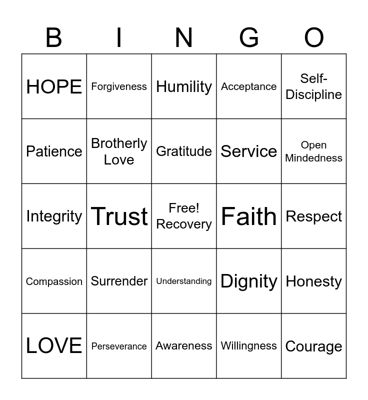 This bingo card has a free space and 24 words: Surrender, Perseverance, Gratitude, LOVE, Self-Discipline, HOPE, Patience, Forgiveness, Faith, Understanding, Service, Integrity, Dignity, Honesty, Brotherly Love, Willingness, Respect, Humility, Open Mindedness, Trust, Courage, Compassion, Acceptance and Awareness.