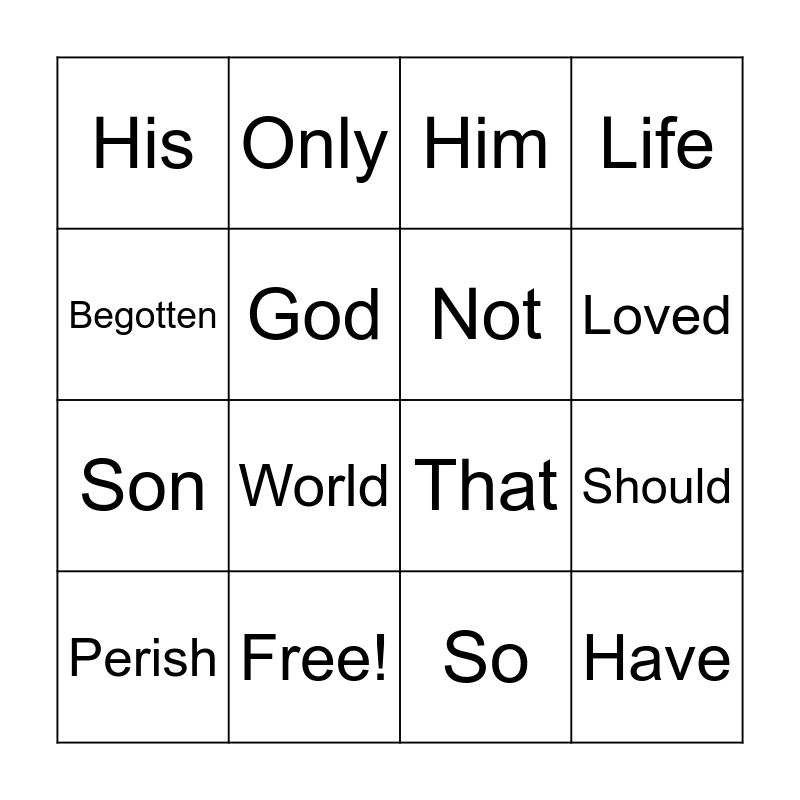 This bingo card has 25 words: For, He, Loved, Gave, Begotten, His, God, Only, Free!, The, Son, That, Whosoever, Believes, Not, In, So, Him, World, Should, Perish, But, Have, Life and Eternal.