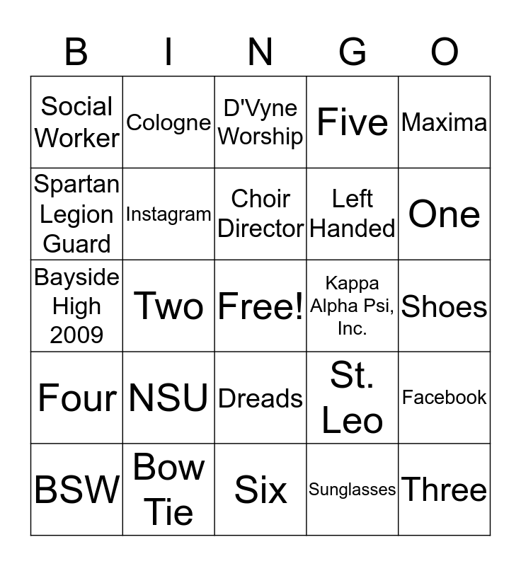 This bingo card has a free space and 24 words: NSU, Bow Tie, Choir Director, BSW, Maxima, Social Worker, Spartan Legion Guard, Cologne, Kappa Alpha Psi, Inc., Dreads, Left Handed, Bayside High 2009, St. Leo, Facebook, Instagram, Sunglasses, Shoes, D'Vyne Worship, One, Two, Three, Four, Five and Six.