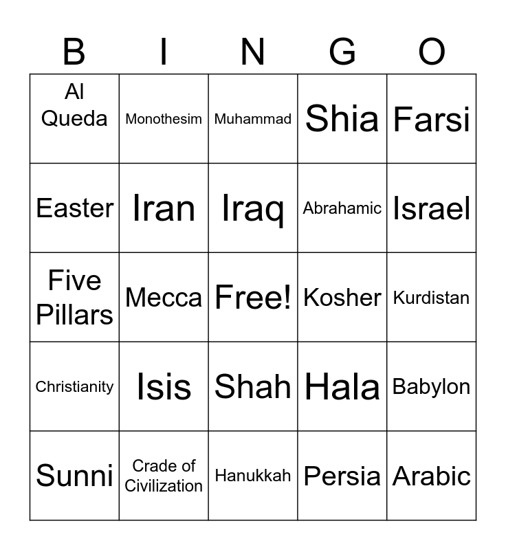 This bingo card has a free space and 27 words: Hala, Judaism, Abrahamic, Hanukkah, Easter, Muhammad, Monothesim, Christianity, Kosher, Babylon, Five Pillars, Shia, Sunni, Crade of Civilization, Israel, Mesopotamia, Iran, Iraq, Isis, Al Queda, Kurdistan, Persia, Mecca, Arabic, Shah, Farsi and Chador.
