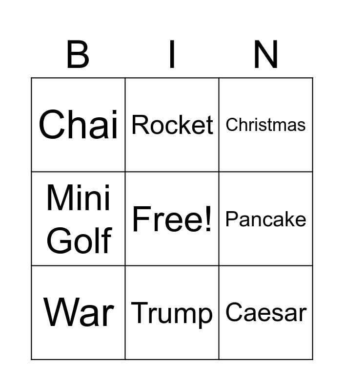 This bingo card has a free space and 25 words: Vodka, Any Pokemon, Trump, Blue, Caesar, Chai, Pancake, Rocket, Salamander, Netflix, Sphinx, Spy, Japan, Super Mario, War, Bigfoot, Crow, Christmas, Dumbledore, Ace, Penguin, Chicken, Minecraft, Mini Golf and Prison.