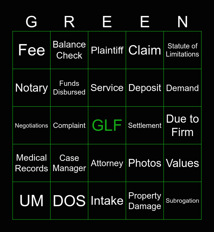 This bingo card has a free space and 44 words: Liability, Subrogation, UIM, UM, Lien, Property Damage, Plaintiff, Discovery, Statute of Limitations, DOS, Claim, Settlement, Attorney, Case Manager, Litigation, Intake, Adjuster, Negotiations, Treatment, Demand, Balance Check, FOIA, Police Report, Fee, Escrow, Due to Firm, Disbursement Statement, Medical Records, Photos, Medical Records, Insurance, Values, Checklist, Summons, Complaint, Companions, Certified, HIPAA, Service, Notary, Deposit, Reduction, Funds Disbursed and Injury.