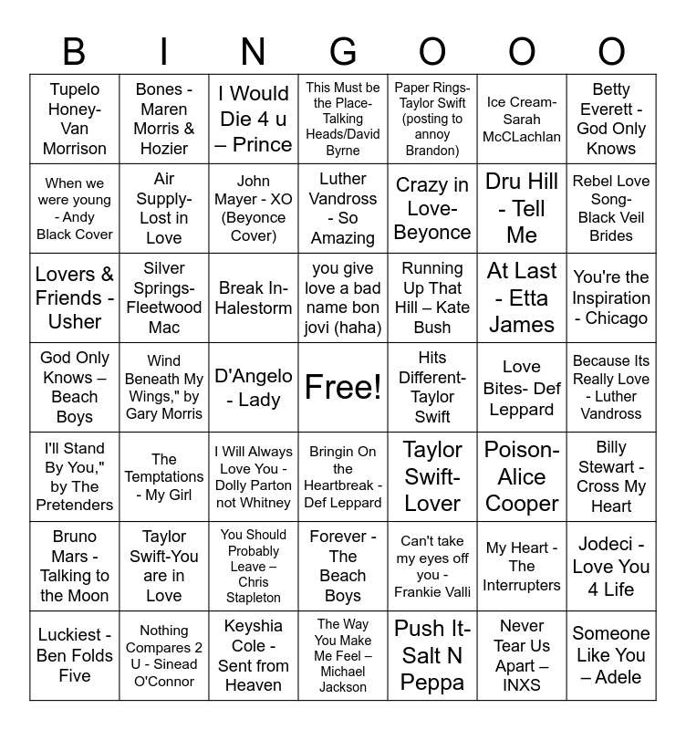 This bingo card has a free space and 64 words: I will always love you-Whitney Houston, Because Its Really Love - Luther Vandross, Always and Forever - Heatwave, At Last - Etta James, I Will Always Love You - Dolly Parton not Whitney, Luckiest - Ben Folds Five, Bones - Maren Morris & Hozier, Leonard Cohen - "Suzanne", When we were young - Andy Black Cover, Nothing Compares 2 U - Sinead O'Connor, you give love a bad name bon jovi (haha), Can't take my eyes off you - Frankie Valli, Lovers & Friends - Usher, Paper Rings- Taylor Swift (posting to annoy Brandon), Eternally Yours: Motion Picture Collection- Motionless In White (There's two versions of this song haha), Ice Cream-Sarah McCLachlan, Crazy in Love-Beyonce, Tupelo Honey-Van Morrison, Take my Breath Away-Berlin, Air Supply- Lost in Love, Break In- Halestorm, Silver Springs- Fleetwood Mac, This Must be the Place- Talking Heads/David Byrne, The Temptations - My Girl, I Wanna Know What Love Is - Foreigner, Poison- Alice Cooper, Bringin On the Heartbreak - Def Leppard, The O'Jays - Emotionally Yours, Love Bites- Def Leppard, Bruno Mars - Talking to the Moon, Friday I'm in love- The Cure, Forever - The Beach Boys, John Cale - "Andalucia", Jodeci - Cry for You, John Mayer - XO (Beyonce Cover), You're the Inspiration - Chicago, My Heart - The Interrupters, D'Angelo - Lady, Billy Stewart - Cross My Heart, Betty Everett - God Only Knows, Luther Vandross - So Amazing, Rebel Love Song- Black Veil Brides, Jodeci - Love You 4 Life, Tevin Campbell - Can We Talk, Keyshia Cole - Sent from Heaven, Dru Hill - Tell Me, God Only Knows – Beach Boys, Someone Like You – Adele, Running Up That Hill – Kate Bush, The Way You Make Me Feel – Michael Jackson, Never Tear Us Apart – INXS, It Had to Be You – Harry Connick Jr., Wind Beneath My Wings," by Gary Morris, I'll Stand By You," by The Pretenders, You Are So Beautiful," by Joe Cocker, You Should Probably Leave – Chris Stapleton, I Would Die 4 u – Prince, Take Me With U – Prince, Taylor Swift-Lover, Taylor Swift-You are in Love, Push It-Salt N Peppa, Still the One (Shania Twain Cover)-boygenius, Hits Different-Taylor Swift and Taylor Swift-This Love.